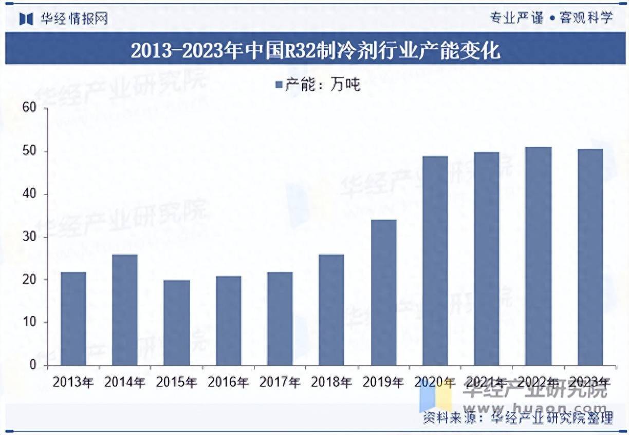 随着环保政策的推动和市场需求的增长,中国R32制冷剂行业的产能近年来持续提升。为替代传统高GWP制冷剂,国内许多制冷剂生产企业加快了R32的生产布局,新增生产线和扩产项目相继投入使用。此外,技术的进步和生产效率的提高也带动了产能的增长,以满足空调、制冷设备等行业对环保型制冷剂日益增长的需求。2023年中国R32制冷剂行业产能接近50万吨。