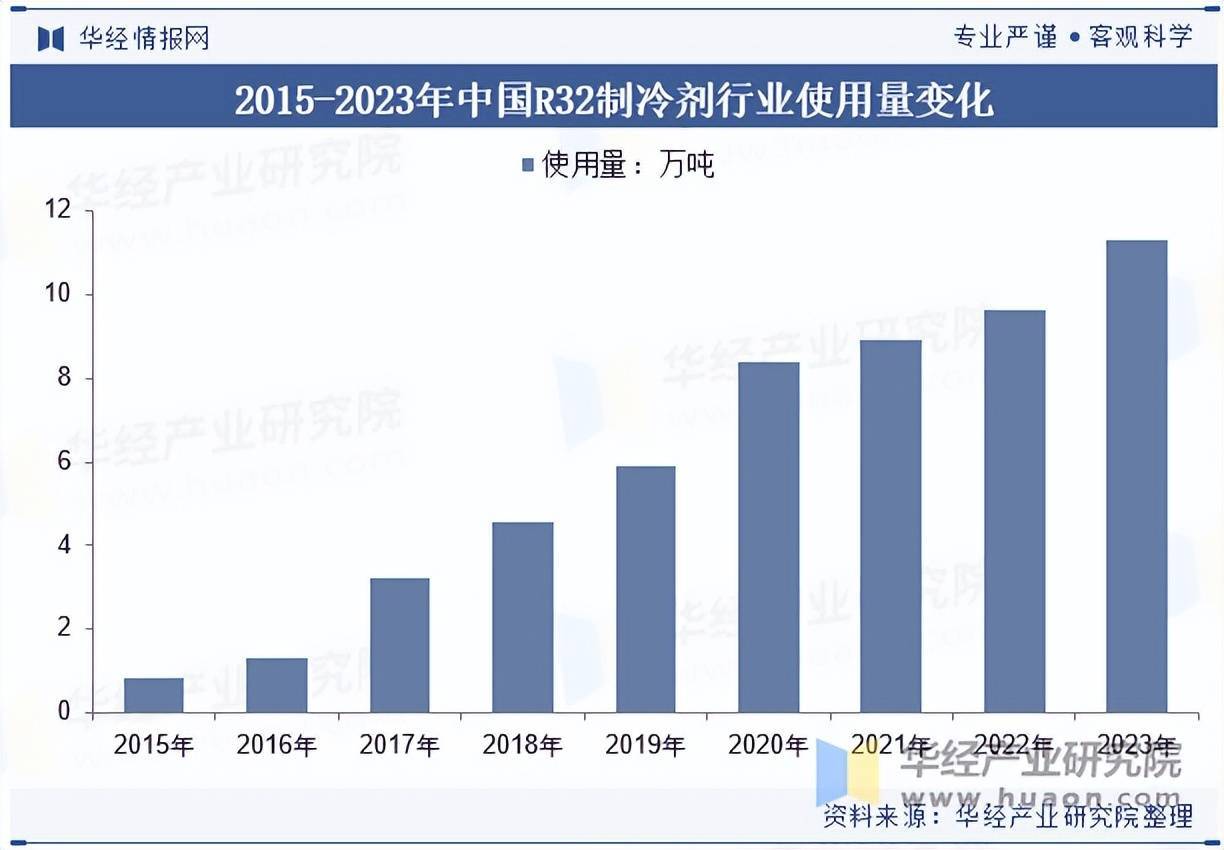 中国R32制冷剂行业的使用量近年来显著增加,主要受益于环保政策的引导和绿色制冷剂市场的需求上升。随着国内空调和制冷设备制造商逐步转向低GWP的R32制冷剂,以替代传统的R22和R410A等高污染制冷剂,R32的应用覆盖面持续扩大。此外,居民和商用空调需求的增长也进一步推动了R32的使用量。2023年中国R32制冷剂行业使用为11.3万吨。